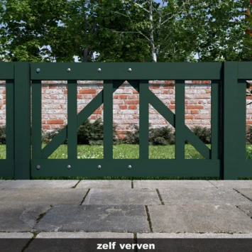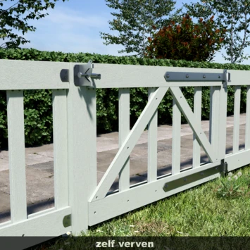 De poort is gemakkelijk te bevestigen tussen 2 palen. Gebruik hiervoor 2 duimhengen met verzet. Deze dient 20cm korter te zijn dan de totale lengte van de poort. Bevestig de hengen met een slotbout en houtboutschroeven aan de poort. Bevestig op de palen de (verstelbare) duimen op de zelfde hoogte. Vervolgens kan de poort gemakkelijk in de duimen geplaatst worden. Bevestig vervolgens een boerenklinkstel op de poort en paal om netjes de paal te kunnen sluiten.