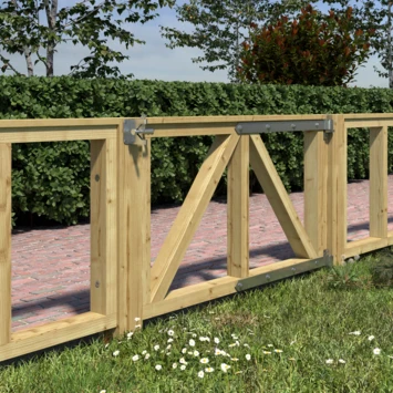 De poort is gemakkelijk te bevestigen tussen 2 palen. Gebruik hiervoor 2 duimhengen met verzet. Deze dient 20cm korter te zijn dan de totale lengte van de poort. Bevestig de hengen met een slotbout en houtboutschroeven aan de poort. Bevestig op de palen de (verstelbare) duimen op de zelfde hoogte. Vervolgens kan de poort gemakkelijk in de duimen geplaatst worden. Bevestig vervolgens een boerenklinkstel op de poort en paal om netjes de paal te kunnen sluiten.
